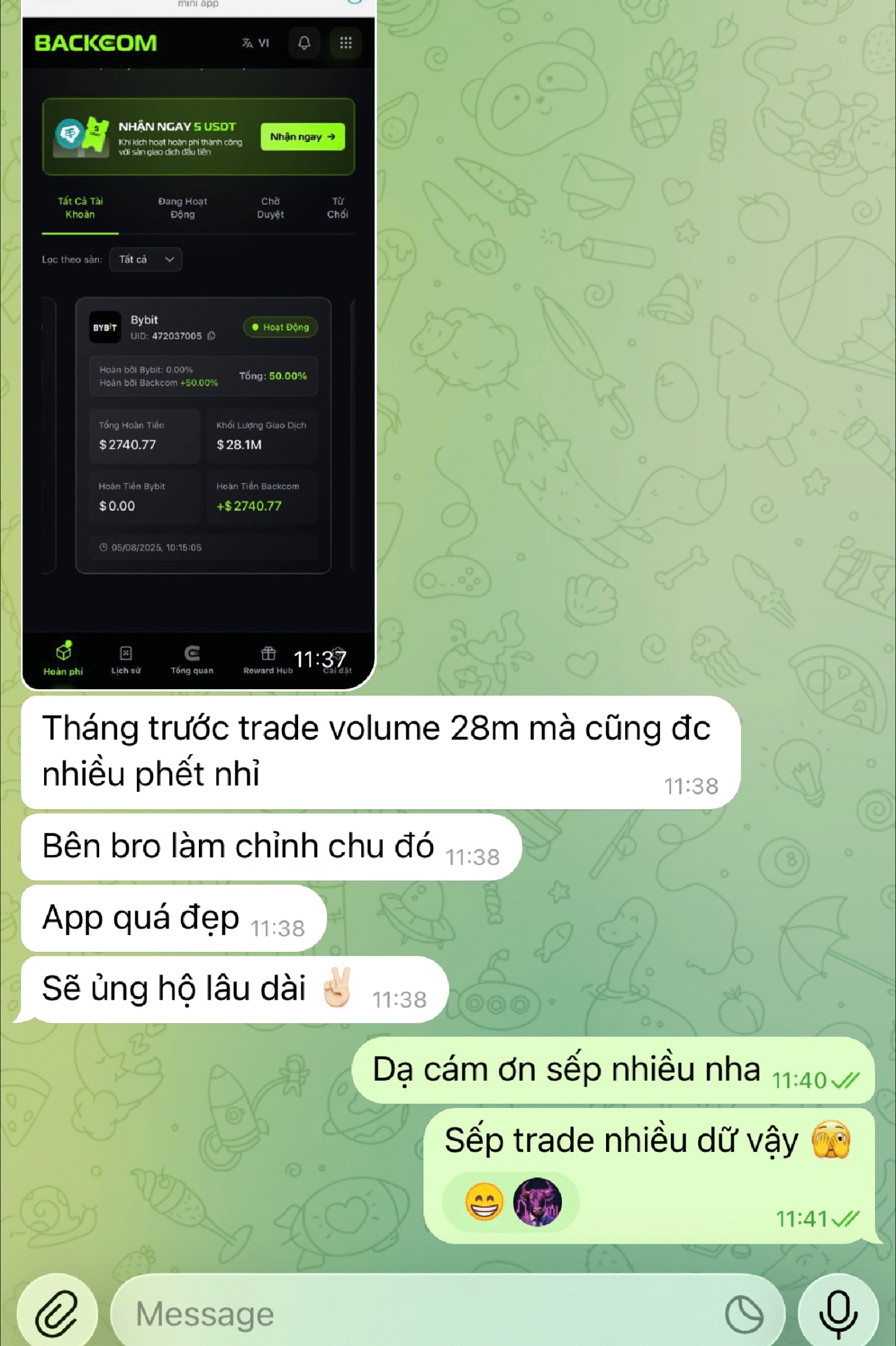 Liên kết UID tài khoản sàn của bạn với Bot Hoàn Phí để kích hoạt tính năng hoàn phí tự động. Dựa trên dữ liệu do sàn giao dịch cung cấp thông qua UID, hệ thống sẽ tự động tính toán và thanh toán hoàn phí định kỳ cho bạn.