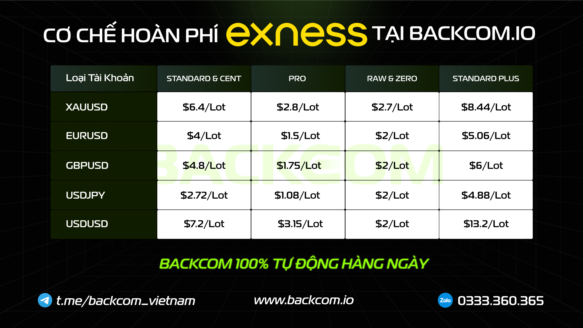 Backcom Exness là chương trình Hoàn Phí Giao Dịch Forex tự động dành cho trader giao dịch tại sàn Exness. Mỗi lệnh giao dịch hợp lệ đều được Backcom 100% tự động hàng ngày. Đăng ký 1 lần nhận hoàn phí trọn đời!