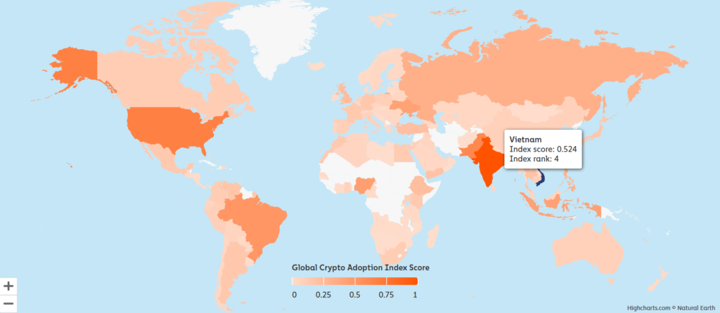 Việt Nam xếp hạng thứ 4 thế giới với số điểm 0.524 (Theo Chainalysis)