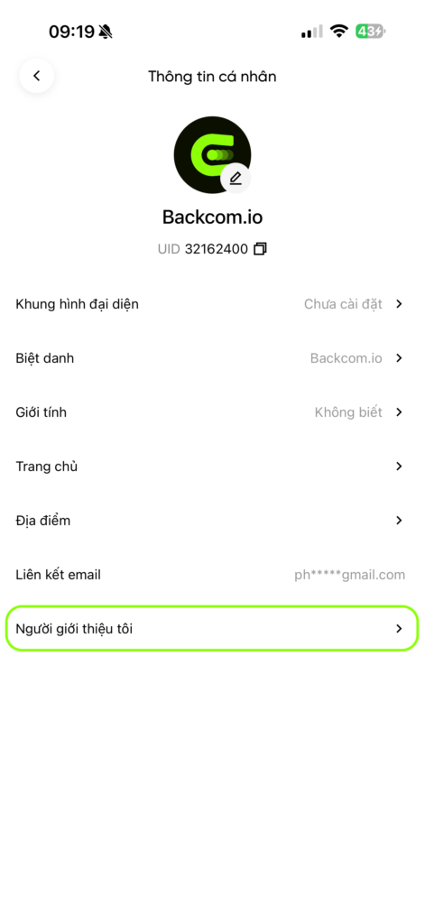 - Không hiển thị hoặc trống → tài khoản chưa gắn mã giới thiệu